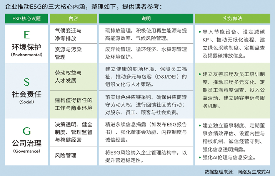 以上是企业运营的核心骨干,也是实践ESG转型的重要层面,以下分述重点如下。