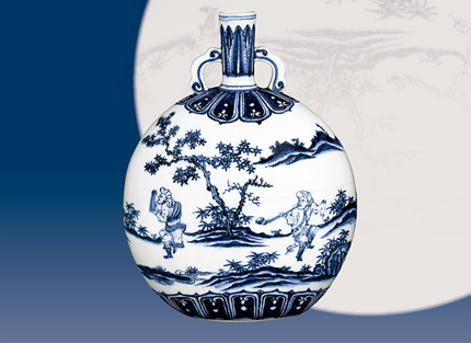 人物纹是元代青花的一大特色,到了洪武官窑消失不见,直到永乐时期才又开始运用,数量虽然不多,但是颇富特色,如本期所要欣赏的扁壶即是代表性的作品。