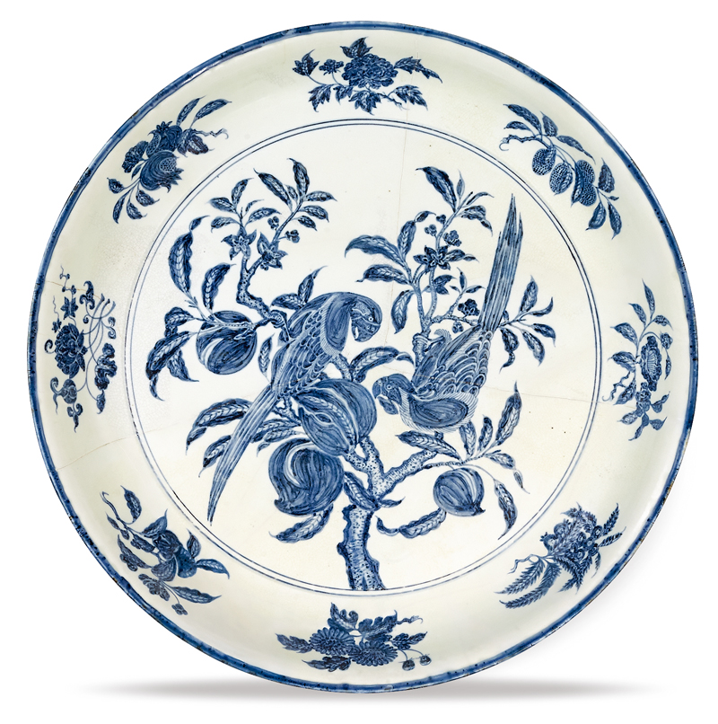 盘口外敞,盘壁弧形下收,底下具有圈足。盘内以弦纹区隔二圈纹饰,侧壁为莲花、菊花、牡丹、石榴、枇杷、鲜桃、荔枝等折枝花果纹,盘心处绘画一株桃树,枝叶繁茂,果实累累,二只鹦鹉伫立其间,一鸟仰首朝上,一鸟俯首与之对望,画面温馨祥和。(高73.5公分)