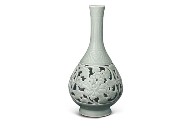 瓶身表面浅浮雕缠枝莲花、如意云头、卷草及莲瓣等纹样,施青釉后高温烧制,因为釉料流动,使浮雕纹饰和器壁凸棱处露白,雕纹边缘则因积釉而略为深暗,突显纹饰的立体效果。