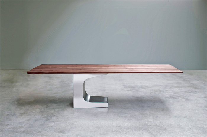 精致加工的280cm长的桌面,缎面拉丝不锈钢饰面C形脚,直线与曲线的交锋是巴西建筑设计师Oscar Niemeyer 1985年设计理念的直接表达。