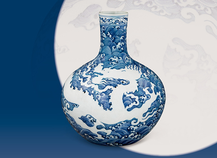 天球瓶是明代永乐时期创烧的新品类,器面常以龙做为装饰的主题,表现技法有白地青花和青地白花二种形态,如本期所要赏析的藏品即是青地白花之类型。
