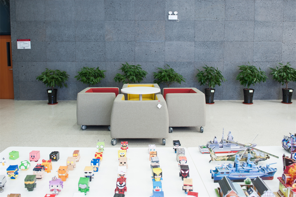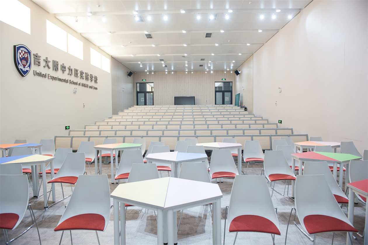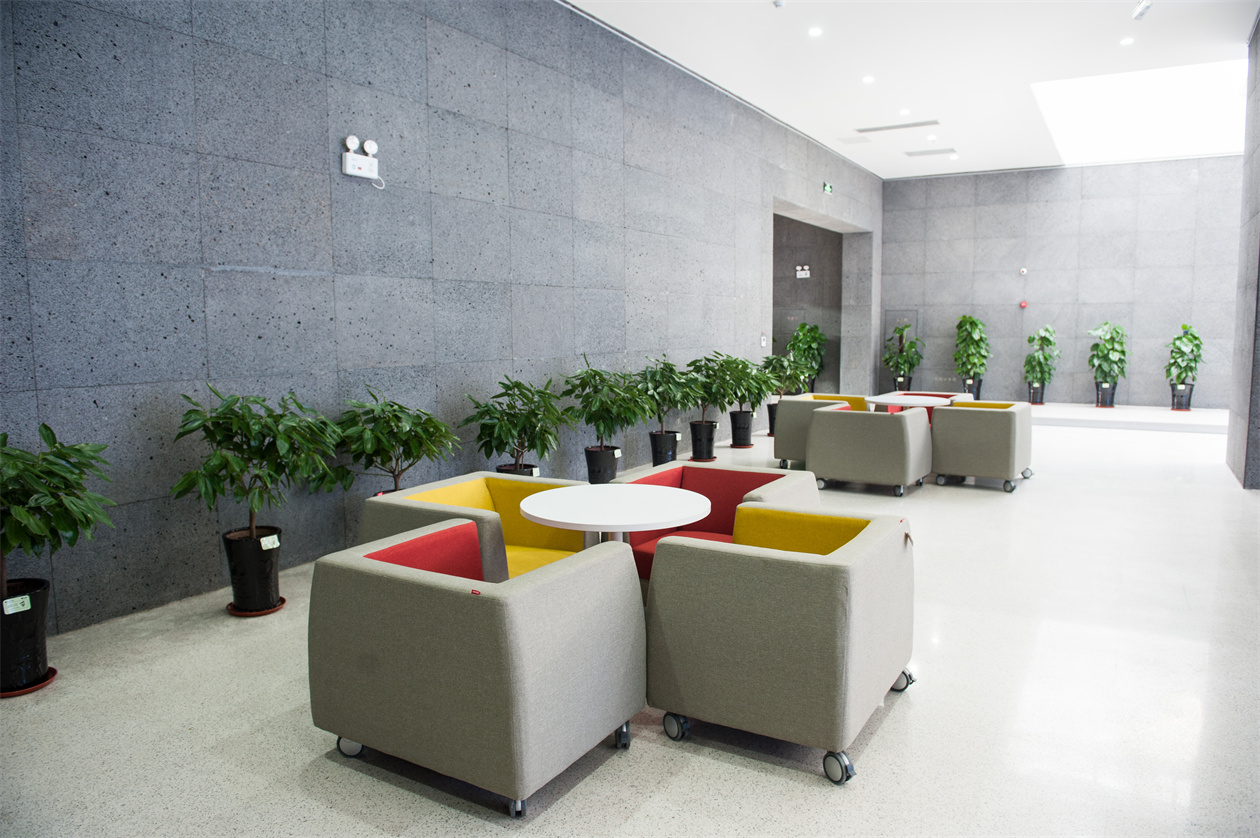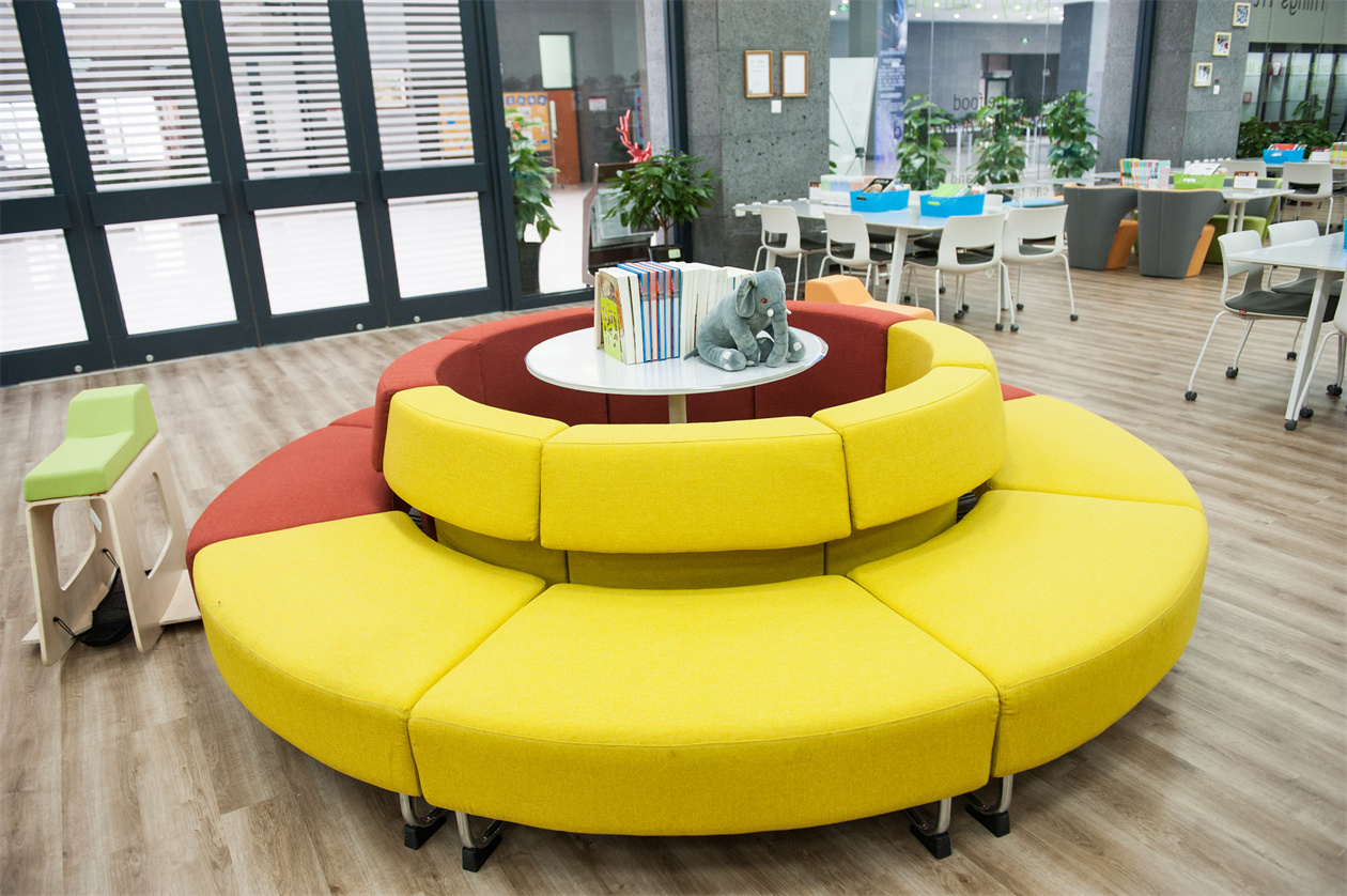 走进学校教学楼,沿着蓝灰色为主调的墙壁向前走,引导至明亮而洁净的接待大厅,这里既是进入学校的走廊,也是展现学生们才华的舞台,几步之外有一组舒适的沙发,供等候的家长们休息,温馨的气氛盎然一室。