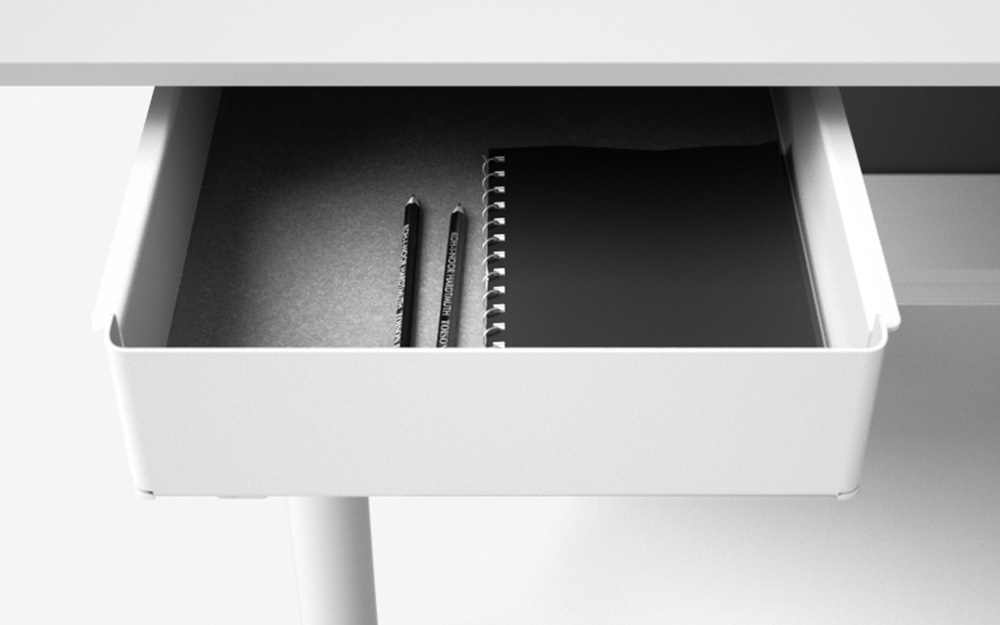 桌下可配置小型抽屉,便于随手收纳文具等物品。亦可配置主机箱吊架,随桌板同步升降,设备线路整齐不紊乱。