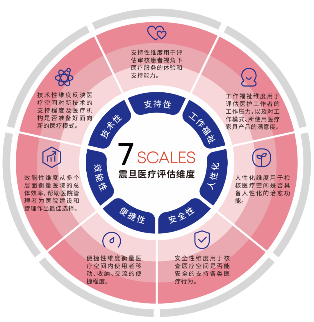 响应国家2030医疗大健康战略,震旦提出了“以医患为中心”的价值主张,将医疗服务的供需双方作为设计核心,通过循证(国内外顶尖医疗设计专家访谈、先进的医疗设计流程梳理、医疗建筑空间案例解析)与共创,并结合服务设计思维不断创新迭代,构筑了震旦医疗评估和设计所使用的七个维度。