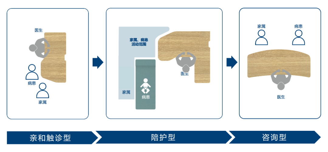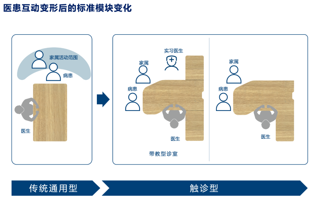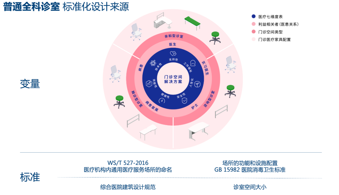 标准化设计来源则根据医生、患者、患者家属、实习医生以及护士五个变量,结合医疗建筑、卫生等标准,总结出了四种全科诊室医患互动关系,并根据不同互动关系,设计出了不同的医疗诊室模块。