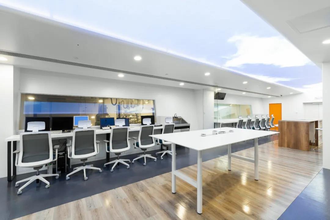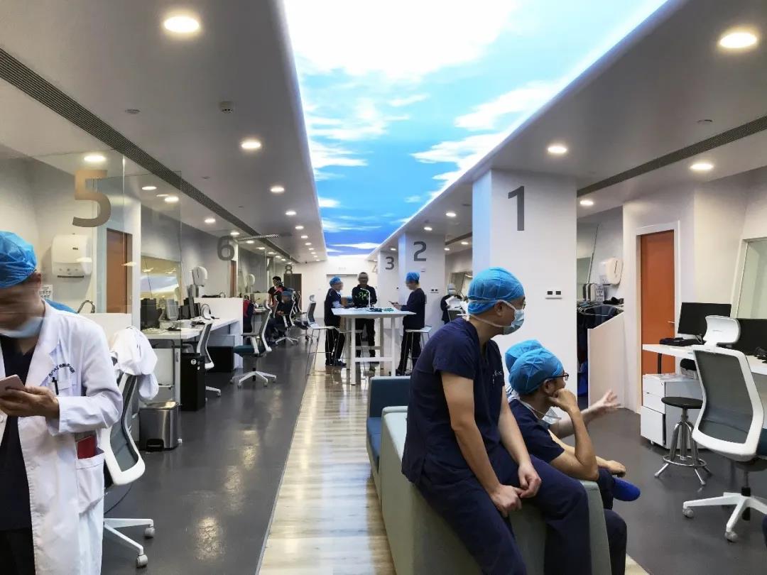 厦心医院导管室左右两边共配有8个手术室,中间区域配备了UP!升降桌,能够满足医生们的讨论或是会议需求。蓝白桌椅响应天花板蓝天白云的灯光设计,进行手术的时候,医生们可以在手术室前的座椅或沙发区观察手术室的情况。