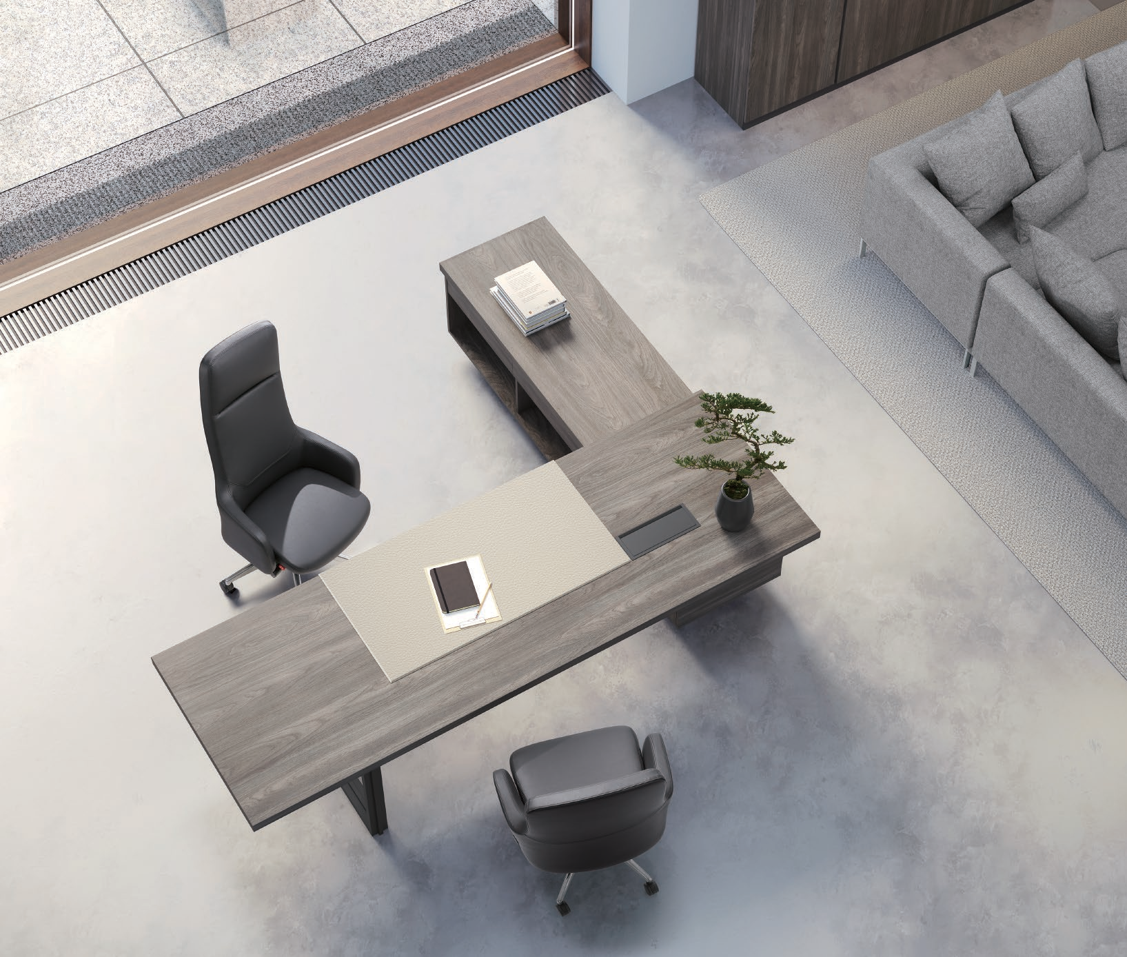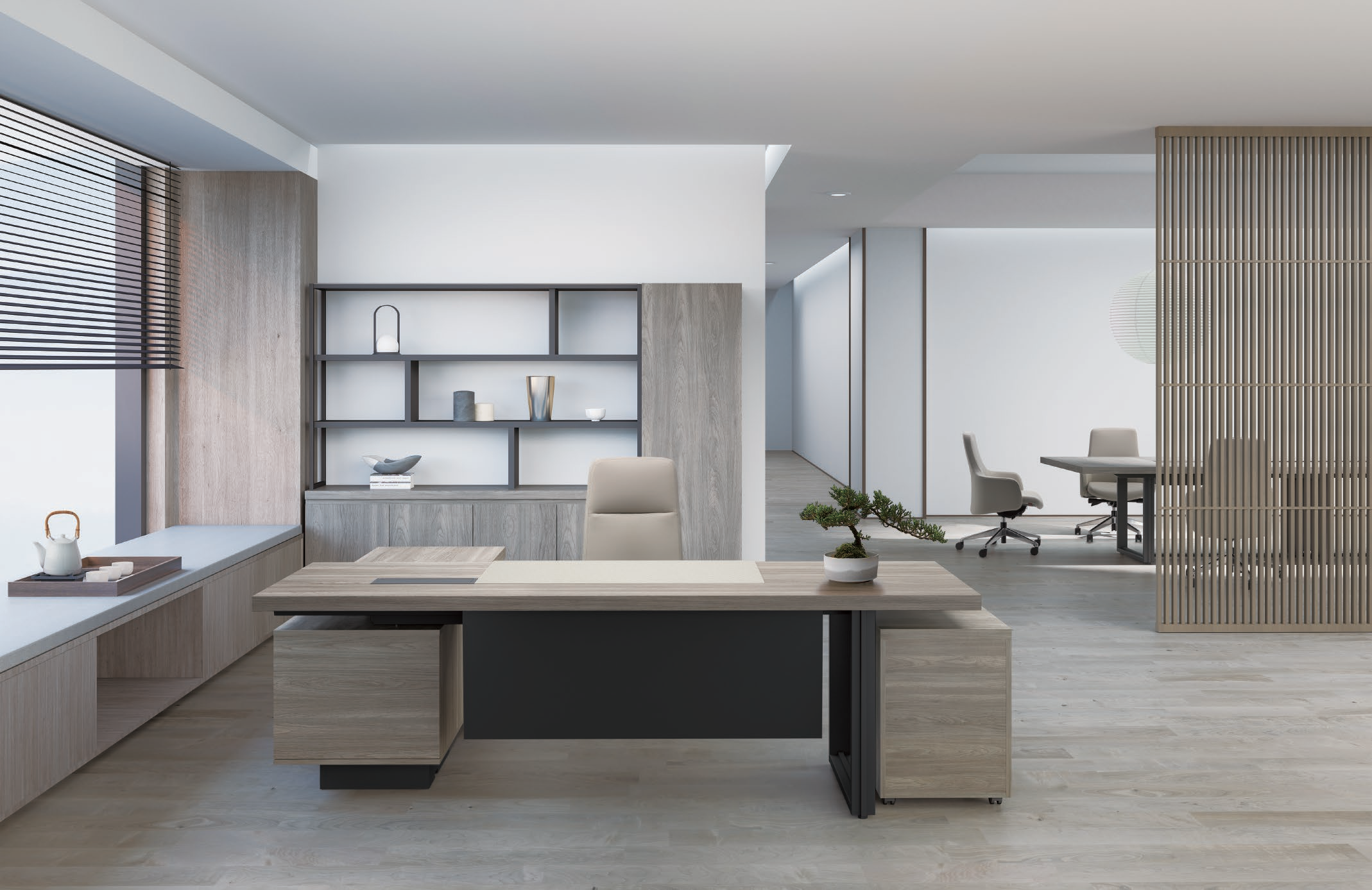 主管空间配备主桌、后柜、会议桌,亦可搭配Cozy沙发茶几使用,满足空间配套的完整需求。现代、简洁、流畅的线条,搭配简约办公环境,形成静谧,内敛平和的工作氛围。