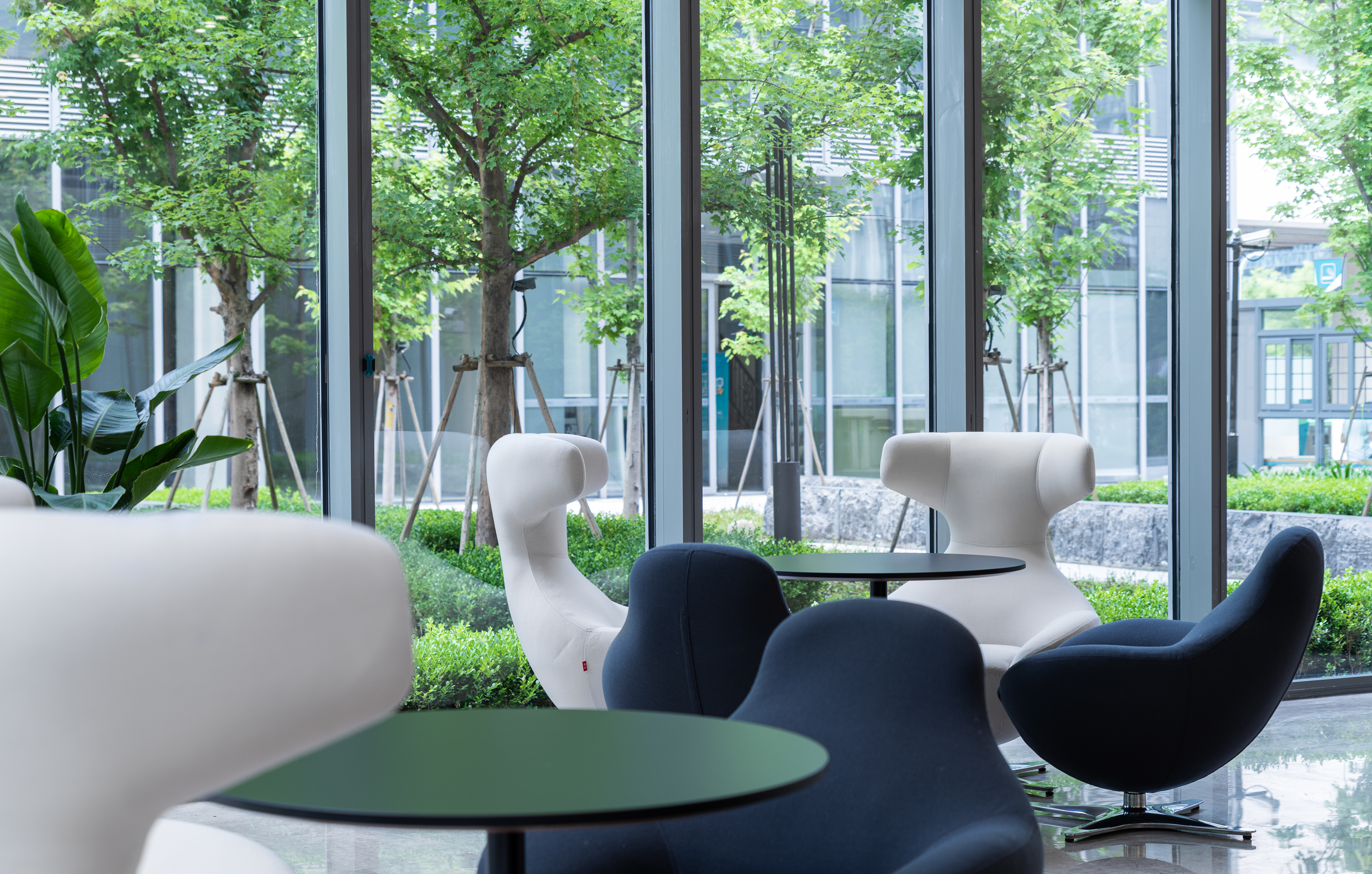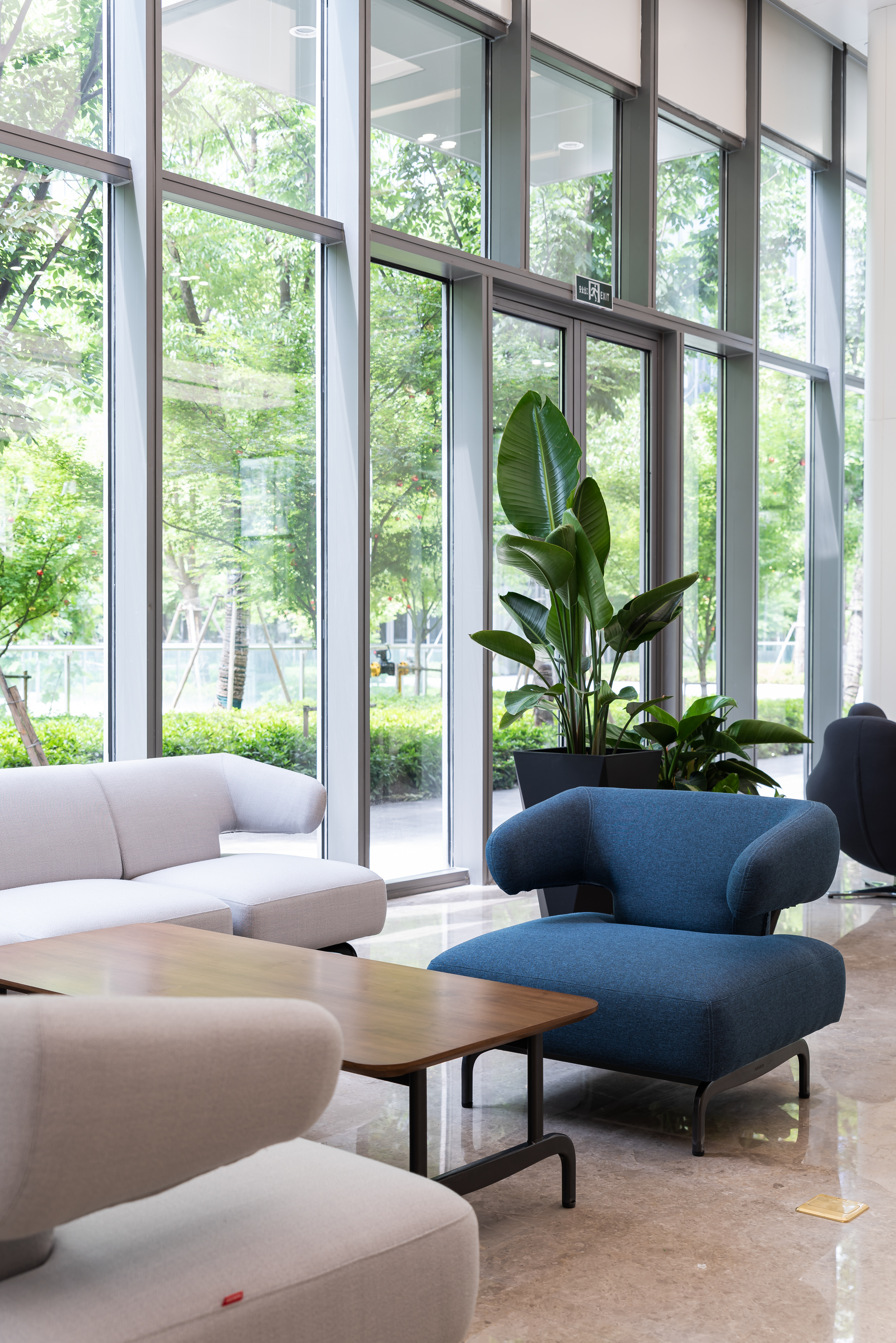 树影斑驳下,大片透明的落地窗让整个等候空间明亮起来。中意生态园希望为所有来访或是休息的客户提供轻松、绿色的环境。利用低饱和度的莫兰迪色系沙发,搭配翠绿植物,为整个空间增添柔和与温馨,减少等候带来的焦躁感。