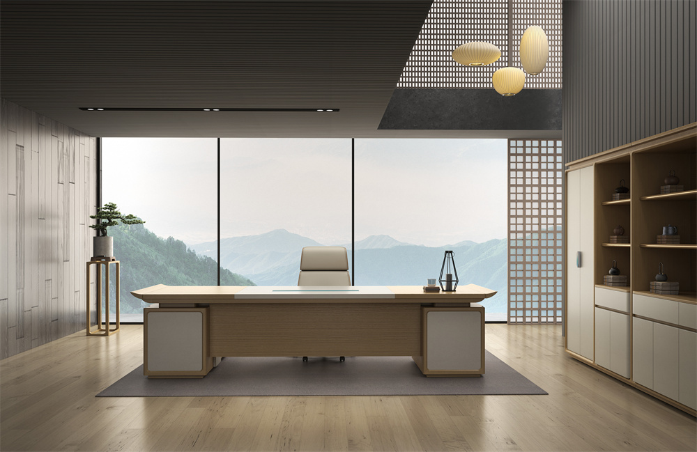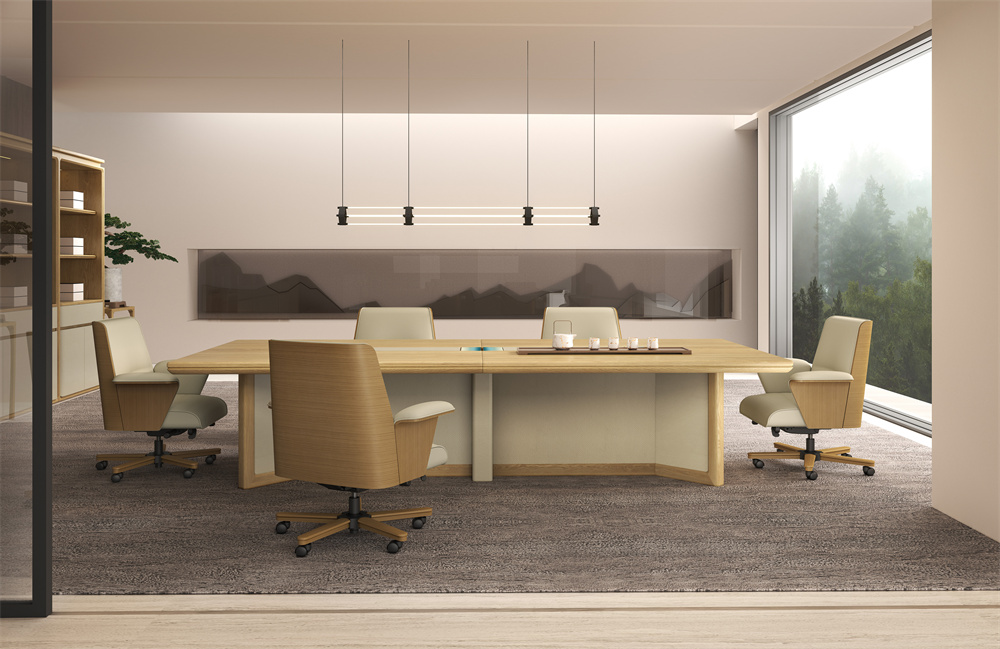 “御之和”极大程度突破传统造型。灵感来自京外名刹之首的河北正定“隆兴寺”独特的“四出山花抱厦”建筑结构特色,如四周墙面凸出成围抱主体之势,震旦家具取“抱厦”格局于主管桌,更包含礼遇上宾之意。