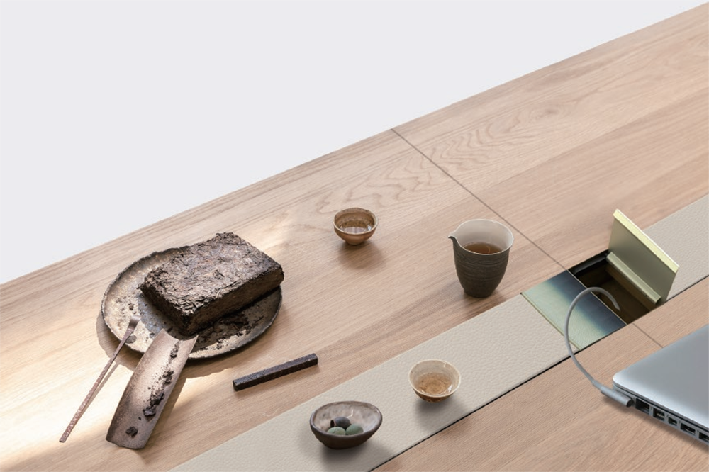 “御之和”传递宋代风雅意境。宋式桌案去繁就简,框架精简,追求实用,气质内敛淡雅。震旦创新团队借鉴虚实结合的设计手法,利用材质色彩与肌理的差别,勾勒出“线与面”的框架感。